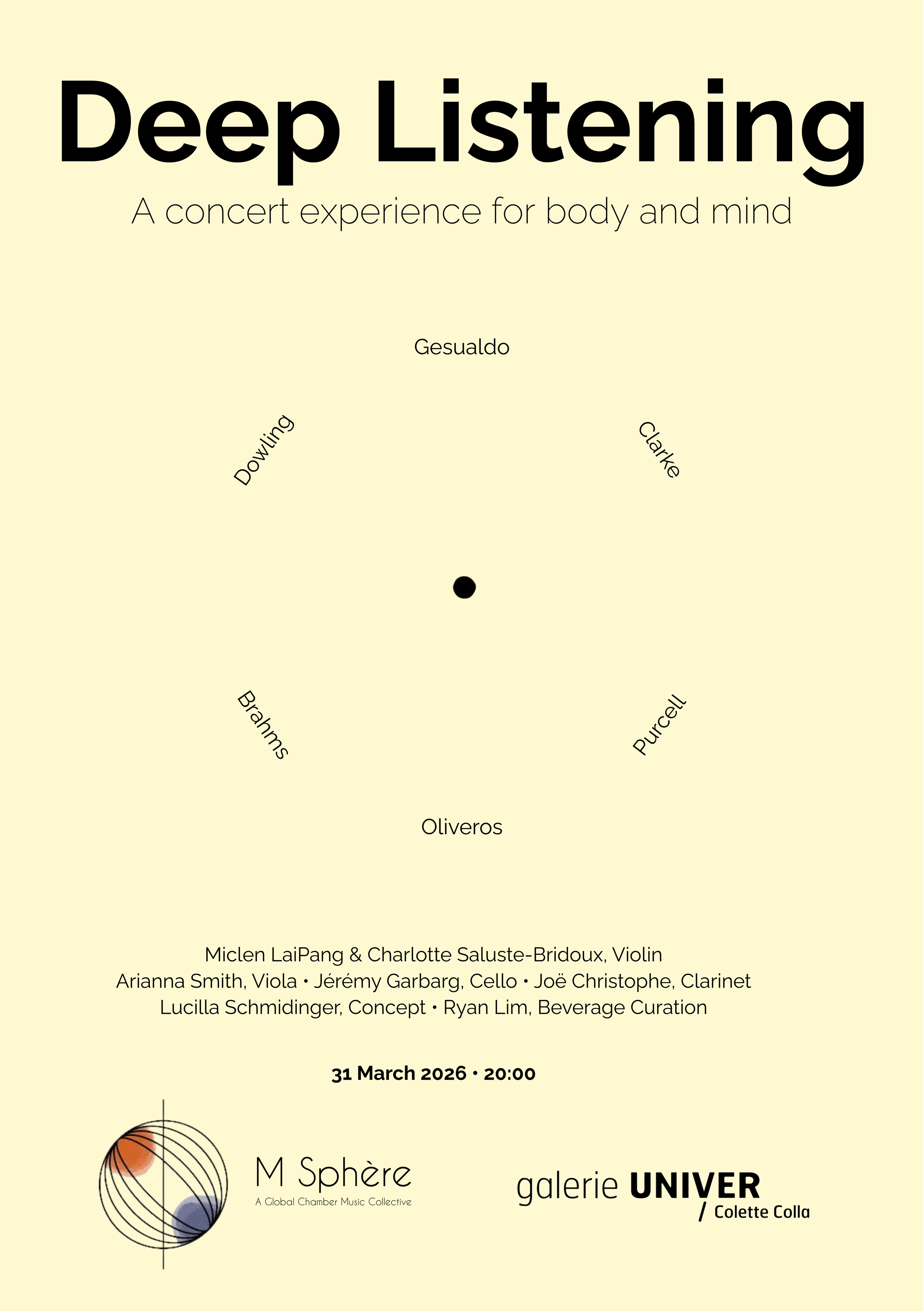 M Sphere, in partnership with dramaturge Lucilla Schmidinger, invites you an evening of deep listening. Beverage curation by Ryan Lim.